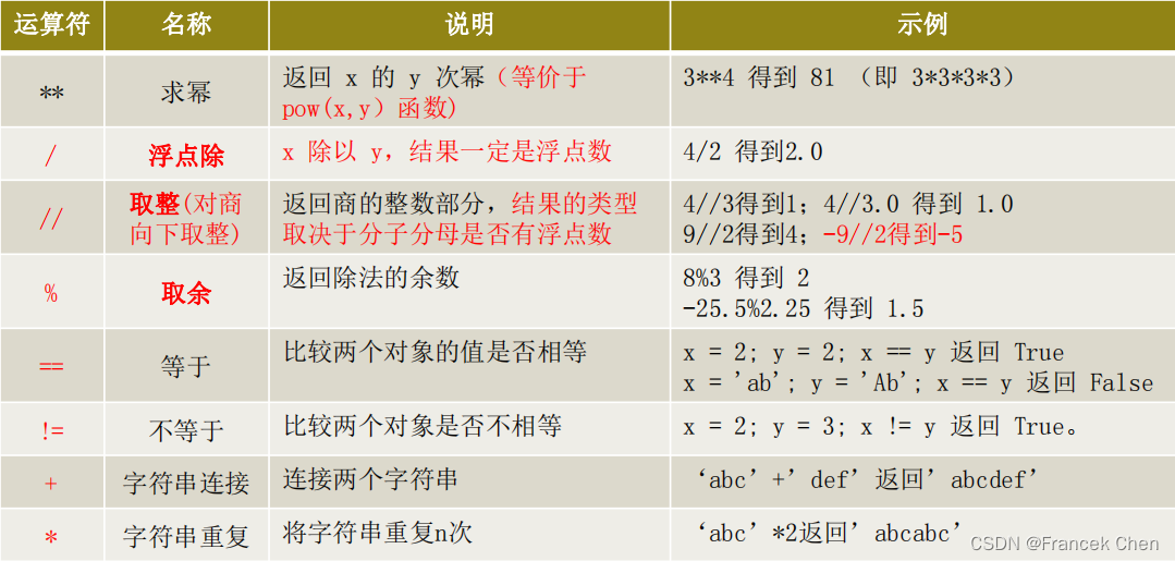 说明:(1)a%b求余数的规则是a-a//b*b,因此-25.5%2.25=-25.5-(-12.0)*2.25=-25.5+27=1.5; (2)求字符串的长度(字符数)可以使用len()函数,例如len('你好abc')的结果是5。