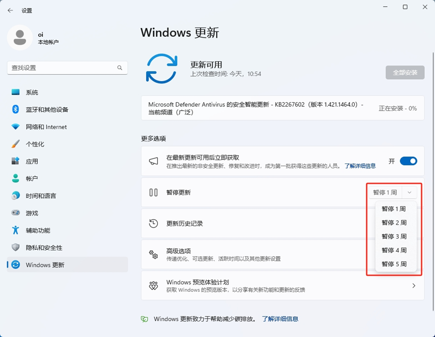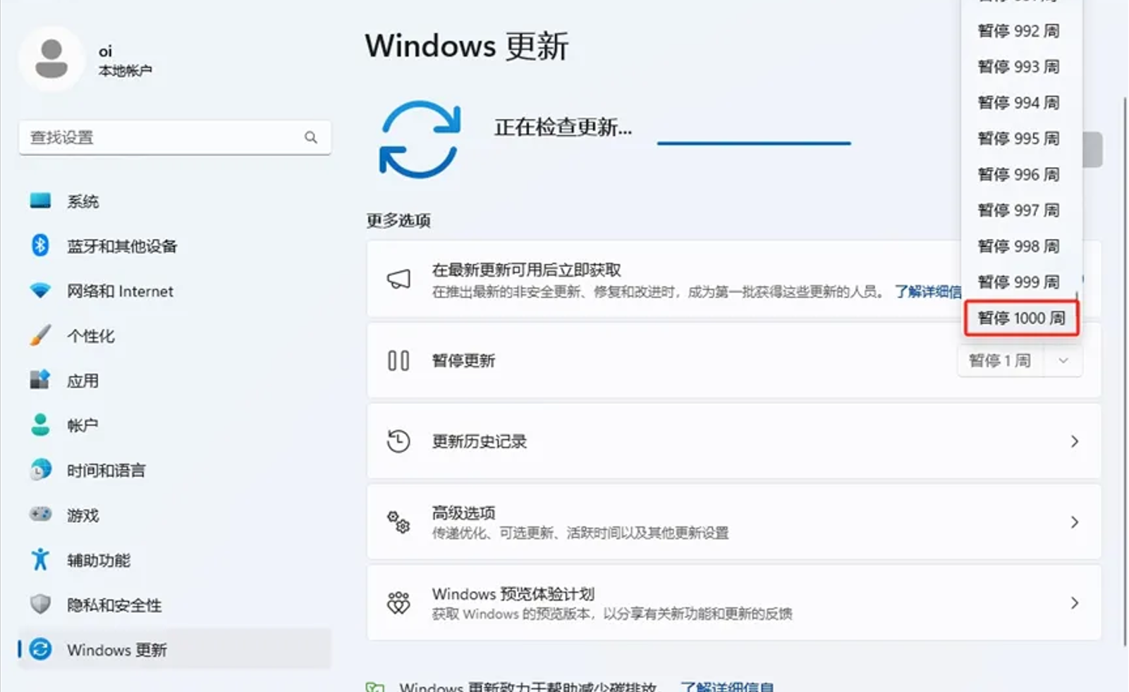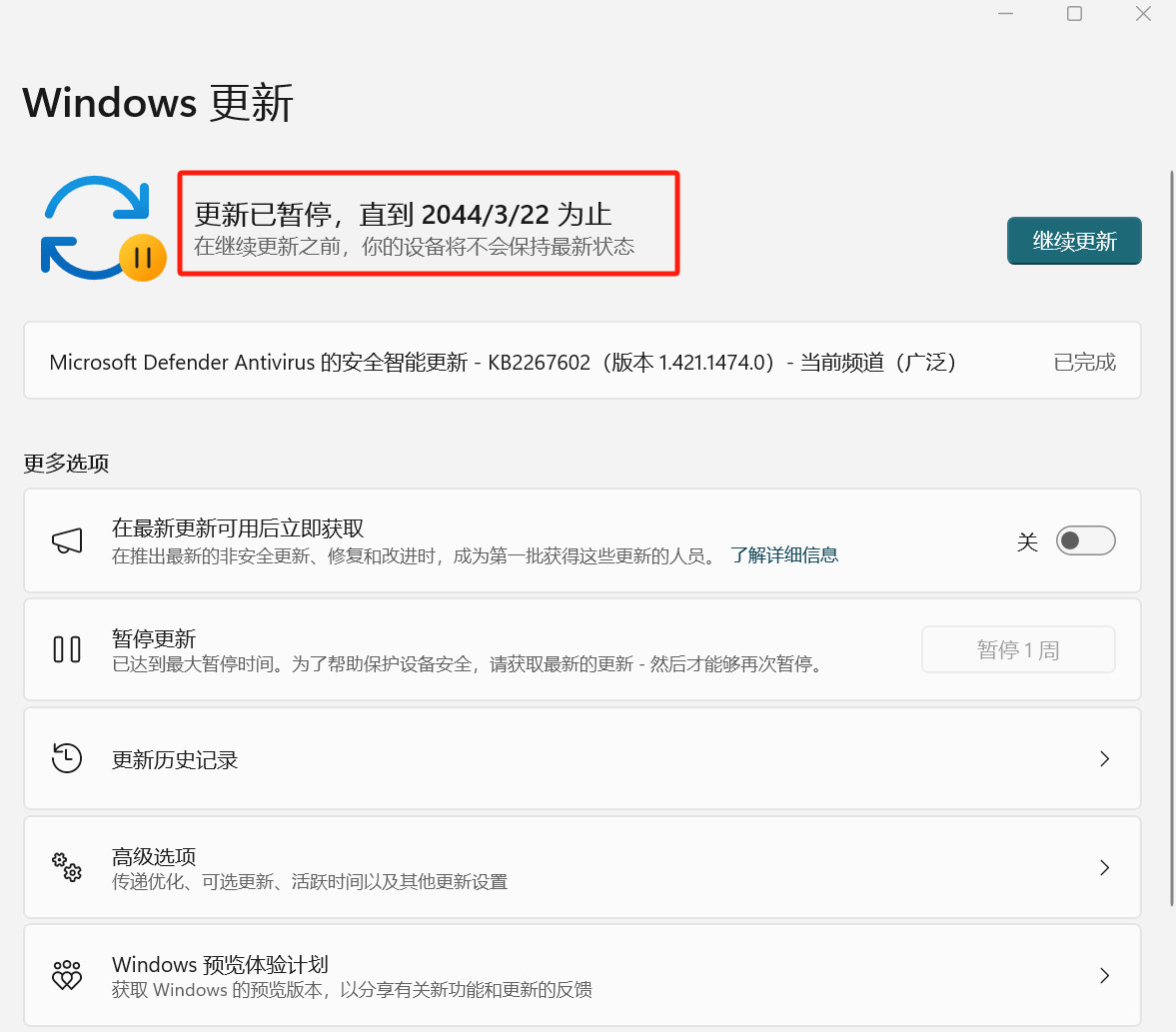 这时就发现,可以暂停1000周,也就是说2044 年之前你将不再受到更新打扰……
