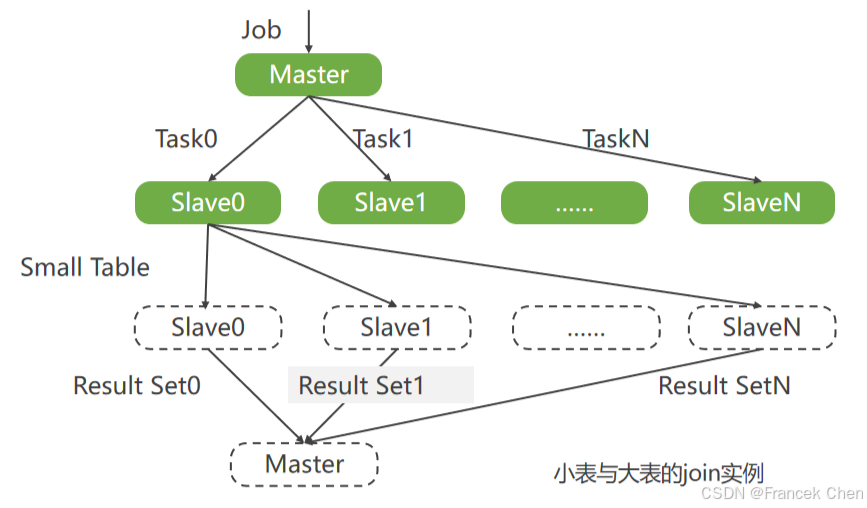 相对于MapReduce架构,DPCA具有实时性、计算的数据本地性以及数据平衡性。MapReduce架构的Job提交过程较为复杂,客户端将Job提交到JobTracker有较长的延迟,JobTracker将Job处理为MapReduce Task后,通过TaskTracker的心跳信息将Task任务返回给TaskTracker,此过程中也存在延迟。MapReduce架构虽然也遵循数据本地性,但仍会有很大比例的数据处理不是本地的。相对于MapReduce架构,DPCA的Job提交是实时性的,在提交Job之前所需程序Jar包已经分发到所有计算节点,在Job提交之后,Master在初始化处理之后即将Task直接分发到所有slave节点上,如图所示。在Job提交后,Master根据数据文件所在位置分配Task,这样在每个计算节点上要处理的HDFS上的数据块就在本地,这样避免了数据的移动,极大地减少了网络I/O负载,缩短了计算时间。每个计算节点会根据Task中SQL解析器生成的执行计划对Task执行的结果进行分发。分发的方式有3种:分发所有中间数据到所有计算节点,分发所有中间数据到部分节点,根据数据所在位置分发,如图所示。并行计算架构能够周期性地对HDFS上的数据表进行维护,保持数据表在所有的DataNode节点上所存储的数据量的平衡,减少因数据负载的不平衡而导致的计算负载的不平衡。   举一个典型的小表与大表Join连接的实例,如图所示,Master解析Job中的执行计划,判断小表的位置后,将Task0发送给Slave0,指令Slave0发送小表到所有节点,而其他节点占接收到的子任务是等待接受小表的数据,接收到数据后将小表与大表连接并将数据返回给Master,当所有数据返回完成则这个Job完成。