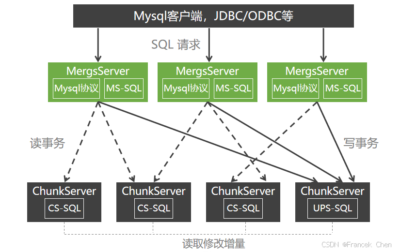 如图所示,用户可以通过兼容MySQL协议的客户端,JDBC/ODBC等方式将SQL请求发送给某台MergeServer,MergeServer的MySQL协议模块将解析出其中的SQL语句,并交给MS-SQL模块进行词法分析(采用GNU Flex实现)、语法分析(采用GNU Bison实现)、预处理,并生成逻辑执行计划和物理执行计划。   如果是只读事务,MergeServer需要首先定位请求的数据所在的ChunkServer,接着往相应的ChunkServer发送SQL子请求,每个ChunkServer将调用CS-SQL模块计算SQL子请求的结果,并将计算结果返回给MergeServer。最后,MergeServer需要整合这些子请求的返回结果,执行结果合并、联表、子查询等操作,得到最终结果并返回给客户端。   如果是读/写事务,MergeServer需要首先从ChunkServer中读取需要的基线数据, 接着将物理执行计划以及基线数据一起发送给UpdateServer,UpdateServer将调用PS-SQL模块完成最终的写事务。   CS-SQL:实现针对单个table的SQL查询,包括表格扫描(table scan)、投影(projection)、过滤(filter)、排序(order by)、分组(group by)、分页(limit),支持表达式计算、聚集函数(count/sum/max/min等)。执行表格扫描时,需要从UPS读取修改增量,与本地的基准数据合并。   UPS-SQL:实现写事务,支持的功能包括多版本并发控制、操作日志多线程并发回放等。   MS-SQL:SQL语句解析,包括词法分析、语法分析、预处理、生成执行计划,按照tablet范围合并多个ChunkServer返回的部分结果,实现针对多个表格的物理操作符,包括联表(Join)、子查询(Subquery)等。