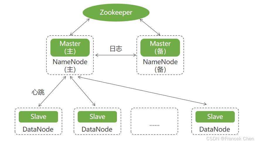 数据立方的分布式并行架构(DPCA)是典型的主从结构,主Master与从Master分别部署在HDFS的主从NameNode物理节点上,而Slave部署在DataNode物理节点上,主从Master使用Zookeeper同步,并共享系统日志,Master与Slave之间用心跳信息保持信息交换。如图所示。