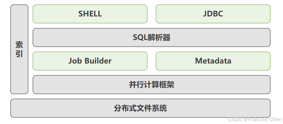 数据立方(DataCube)的结构分为用户接口、索引、SQL解析器、作业生成器、元数据管理、并行计算架构、分布式文件系统等部分,如图所示。