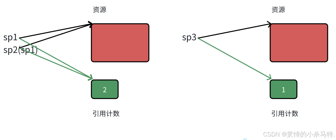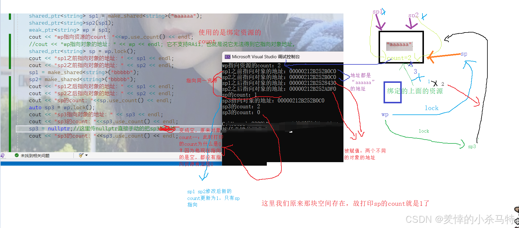 这里告诉们weak_ptr无地址,只是绑定资源,其次就是要注意lock转换成shared_ptr去访问绑定的资源,然后比如shared_ptr或者unique_ptr置nullptr相当于让它指向空,故原先资源的count--;它现在的count置为0。