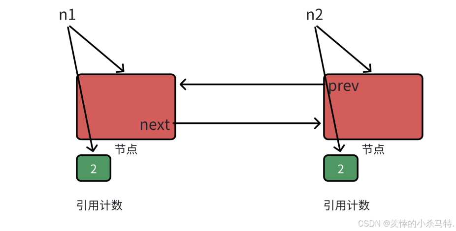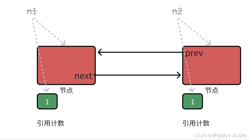此时如果我们析构右边的节点,就要先析构next,然后就是要析构n1,析构n1就要先析构n2的prev,然后就是先析构n2;这样不就绕回来了。具体一下比如我们在n1指向的对象里析构了next