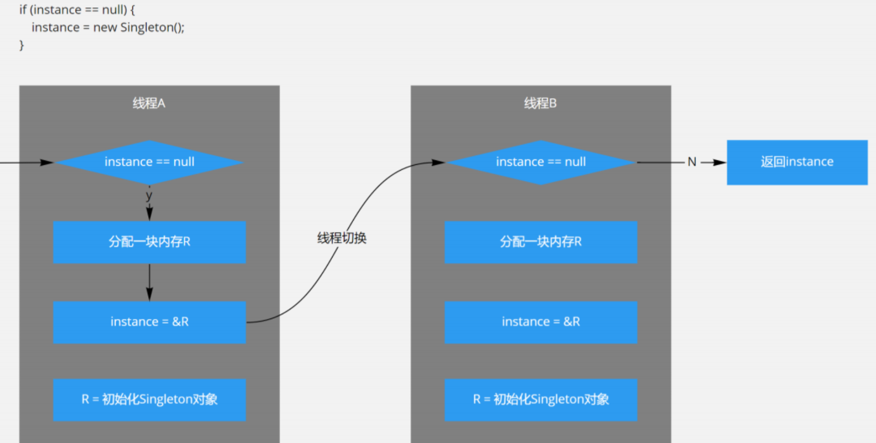 答案是否定的,对于单实例来说,instance按上面先分配空间,然后直接指向空间,在初始化,不会有任何问题。