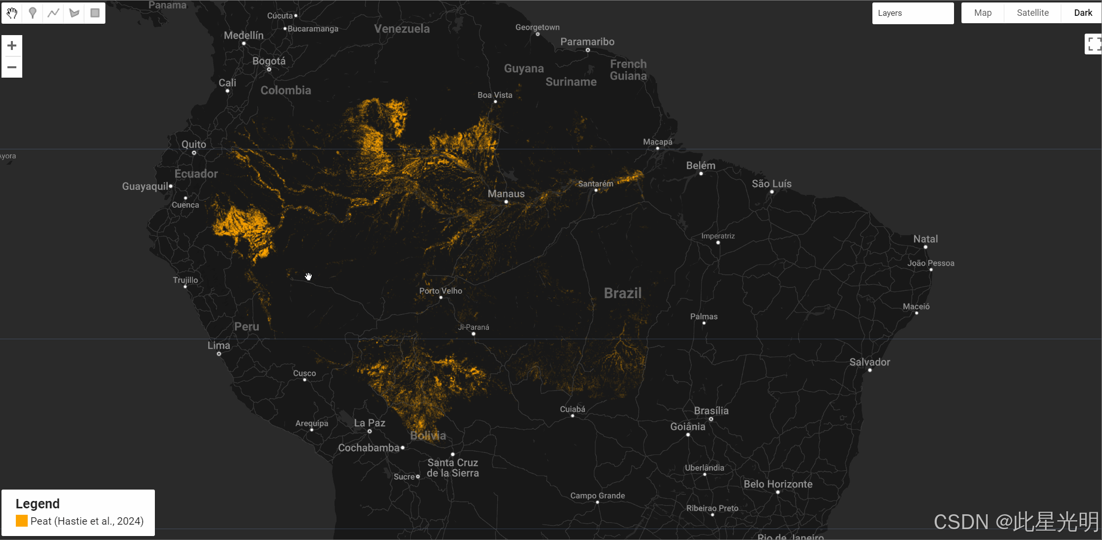 基于随机森林的预测,使用实地参考点和遥感数据。 空间范围: 亚马逊河流域,包括秘鲁北部、里奥内格罗河流域、奥里诺科河流域西南部和玻利维亚。 预测泥炭地面积: 模型性能: 在秘鲁北部等某些地区的可信度较高;在巴西、玻利维亚和里奥内格罗河流域等地区的不确定性较高。 实地参考点: 亚马逊泥炭地及其周围的 2,413 个地面点。 90 米分辨率下整个研究区域(亚马逊盆地海拔低于 500 米,年平均降水量大于 1,390 毫米)的泥炭(厚度≥ 30 厘米的有机土壤)预测范围。