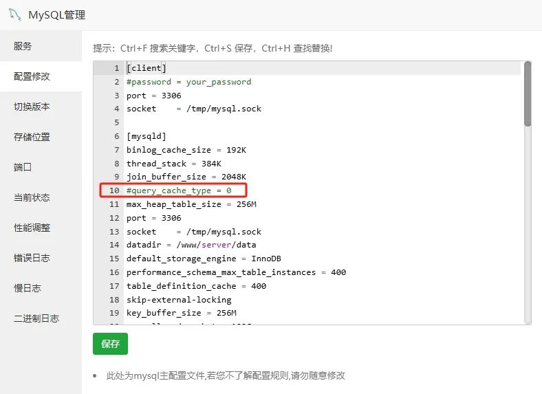所以如果你的 MySQL 数据版本为 8.x.x 及以上,并且使用宝塔面板的 MySQL 管理中的优化方案进行过调整切换,那么大概率就是 MySQL 无法启动的原因了,所以解决办法就是将 query_cache_size 设置为 0、query_cache_type 相关的配置注释掉。