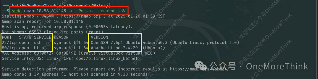 对靶机进行全端口扫描、服务扫描、版本扫描,发现22/SSH、80/HTTP。