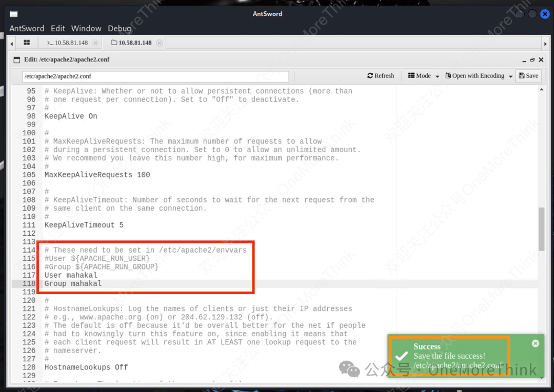 编辑配置文件,修改启动Apache服务的用户和用户组。经测试,无法使用root用户启动Apache服务,natraj用户无法提权到root用户,因此将启动Apache服务的用户修改为mahakal。
