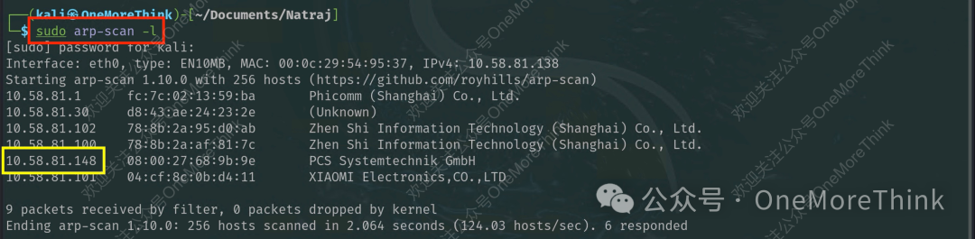 靶机启动后,没有提供IP地址。由于Kali和靶机在同一个C段,可以扫描ARP协议获取靶机IP地址。