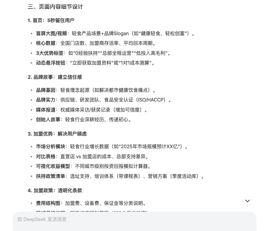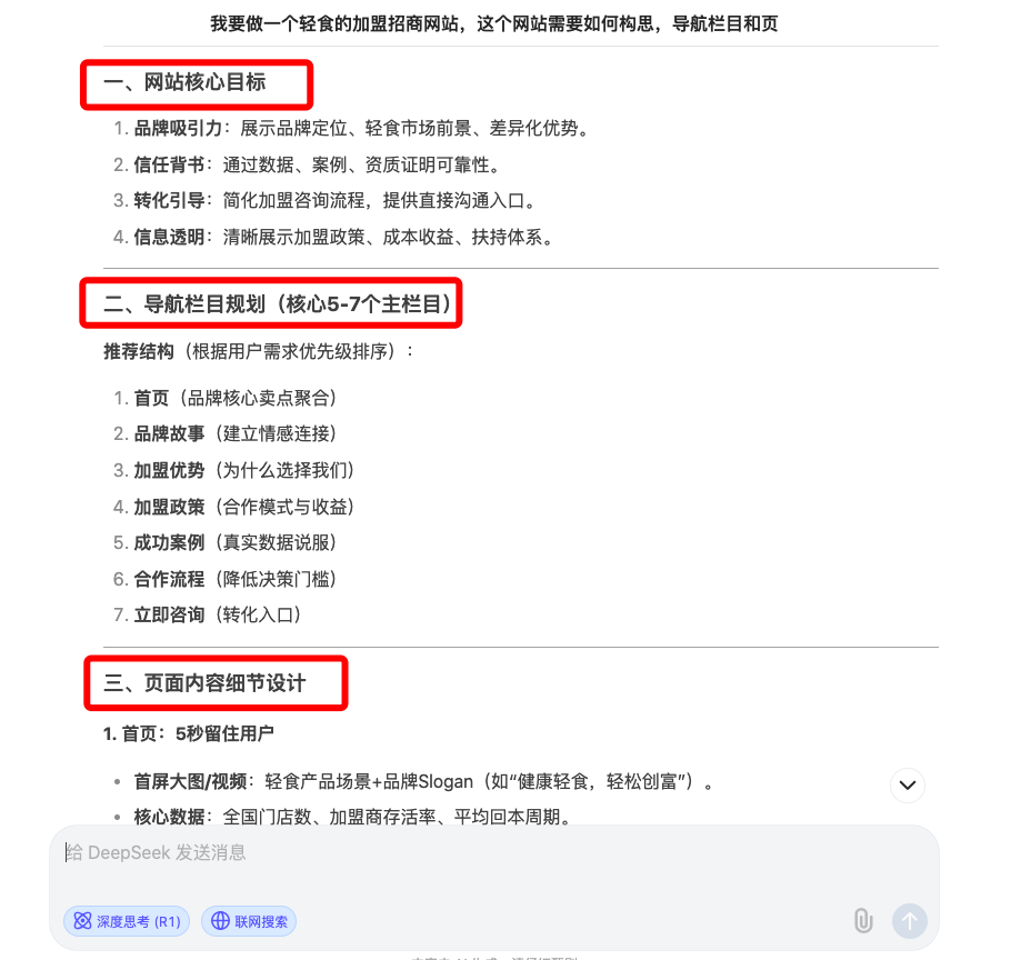 首先第一个步骤,先让AI帮我生成网站栏目框架,还有页面放什么内容。无脑直接输入,跟DeepSeek说下我的问题,需求是啥就行,跟"DeepSeek"说话,不需要一大堆枯燥的提示词,直接说问题,方便很多,小白就能上手操作,发起对话。