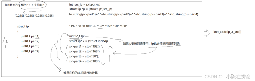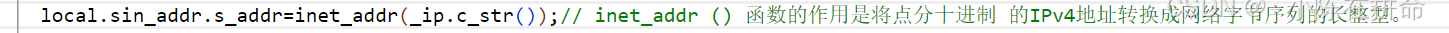 local.sin_addr.s_addr=inet_addr(_ip.c_str());// inet_addr () 函数的作用是将点分十进制 的IPv4地址转换成网络字节序列的长整型。