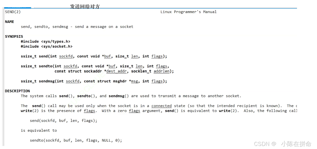 // 创建 socket 文件描述符 (TCP/UDP, 客户端 + 服务器) int socket(int domain, int type, int protocol); // 绑定端口号 (TCP/UDP, 服务器) int bind(int socket, const struct sockaddr *address, socklen_t address_len); // 开始监听socket (TCP, 服务器) int listen(int socket, int backlog); // 接收请求 (TCP, 服务器) int accept(int socket, struct sockaddr* address, socklen_t* address_len); // 建立连接 (TCP, 客户端) int connect(int sockfd, const struct sockaddr *addr, socklen_t addrlen);