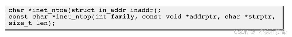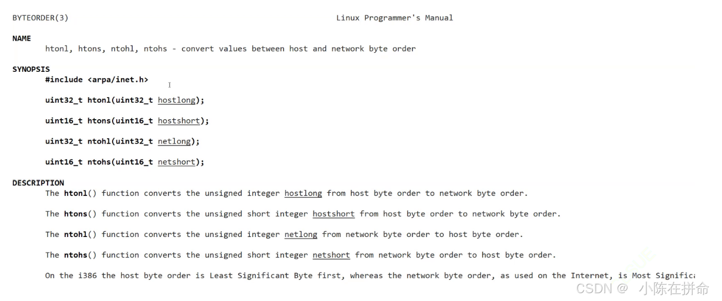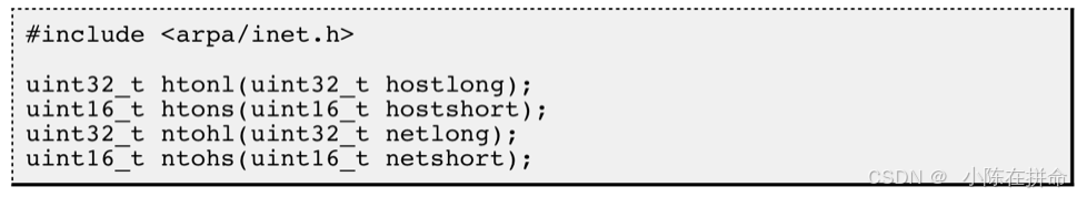 为使网络程序具有可移植性,使同样的C代码在大端和小端计算机上编译后都能正常运行,可以调用以下库函数做网络字节序和主机字节序的转换。