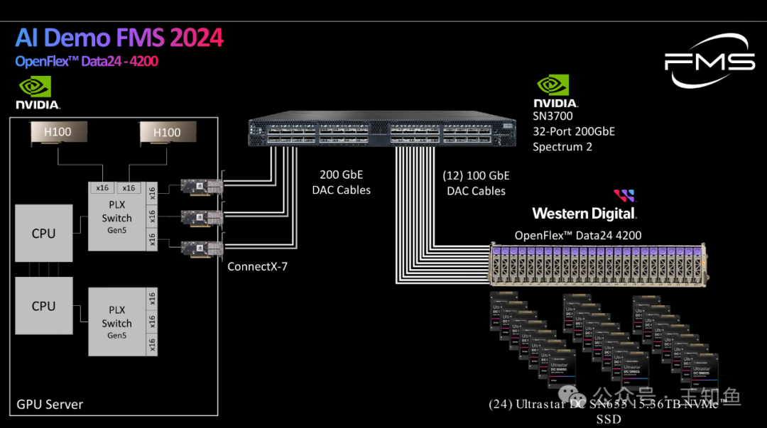 - 存储解决方案: 使用Western Digital的OpenFlex™ Data24 4200存储系统,包含24个Ultrastar DC SN655 NVMe SSD,每个容量为15.36TB。