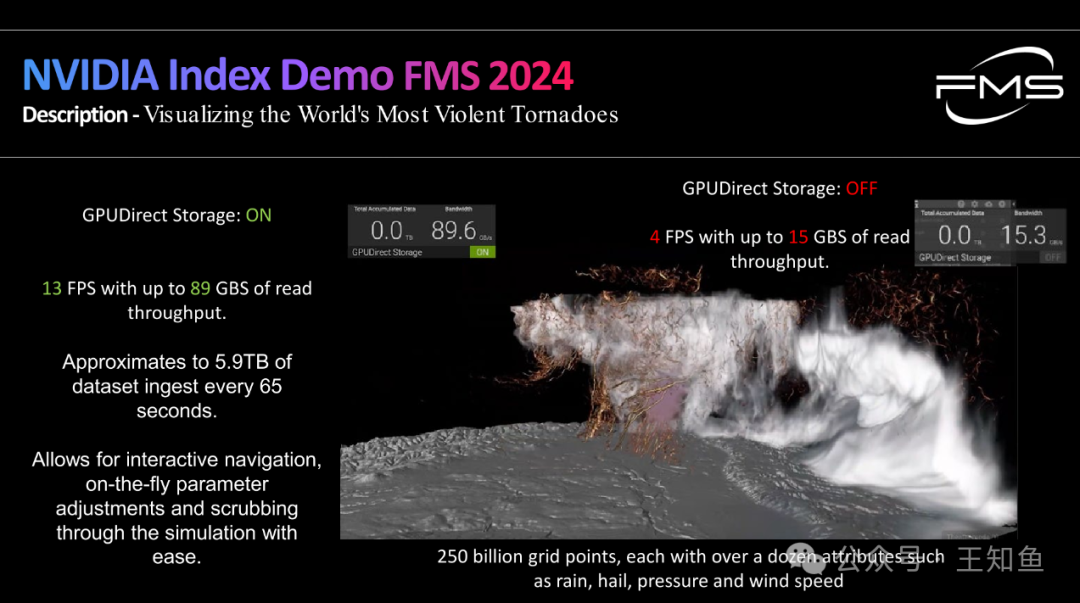 - 演示中使用了2500亿个网格点,每个网格点包含多种属性,如降雨、冰雹、气压和风速,以实现高度详细的龙卷风模拟。