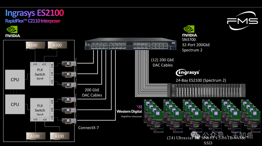 图示 Nvidia 基于WD SN655系列 NVMe-SSD 构建的GDS 直连存储AI加速服务器,主要特征如下(从左往右):