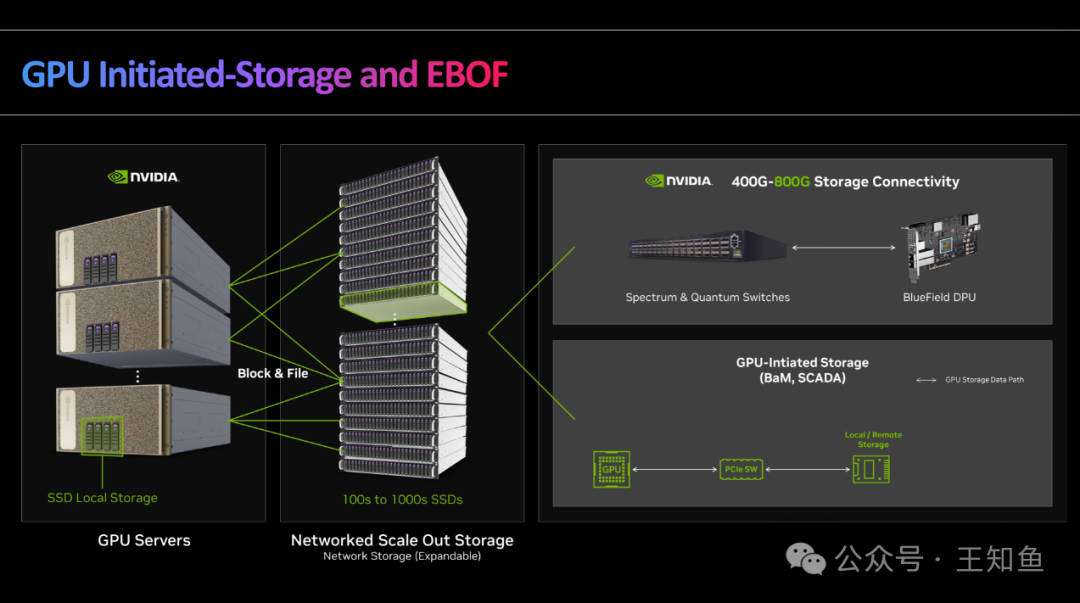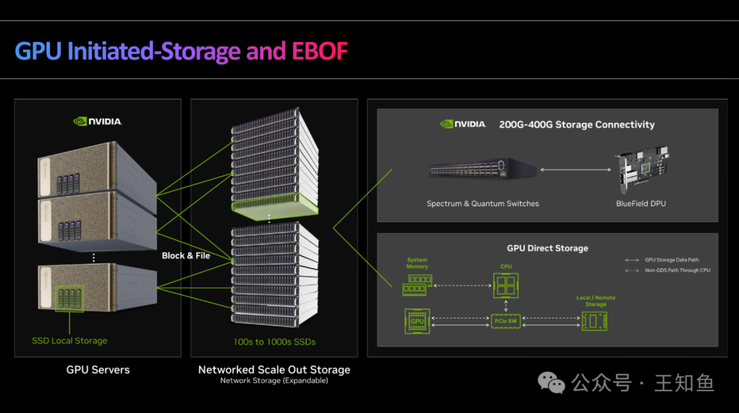 - 基于网络扩展的存储系统(文件/块存储),DPU加持下的数据网络交换机,可支持GPU直接存储访问和通过CPU调度存储两种IO行为;
