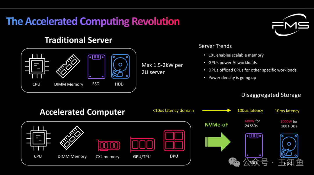 - 10毫秒延迟 -> NVMe-oF连接HDD,功耗:1000W(100个HDD)