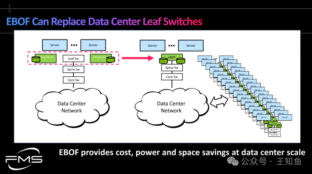 基于NVMe的直接访问协议,EBOF存储系统内部集成了强大的通信系统,在新型数据中心设计中,可省去原架构中独立的存储接入网络。