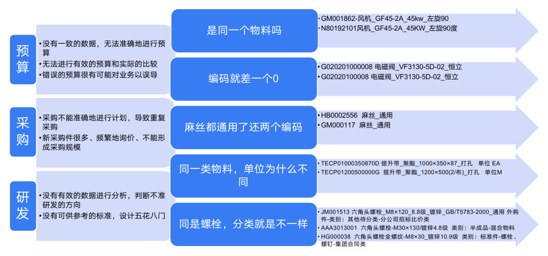 我们可以看到这里少了一个度,并且编码是不一样的,但从这个主体来说,它是 同一个物料,但是却存在两条记录;像第二个也是,它的编码只差了一个0,但编码的却是两个;下面的数据也同样如此,当企业在做物料的预算时,由于找不到到底是那条数据缺失了,所以他没办法做一个准确的预算。对于采购也是如此,当业务系统里存在两条采购数据,这样就会导致一些大量的重复采购,从而浪费资源。