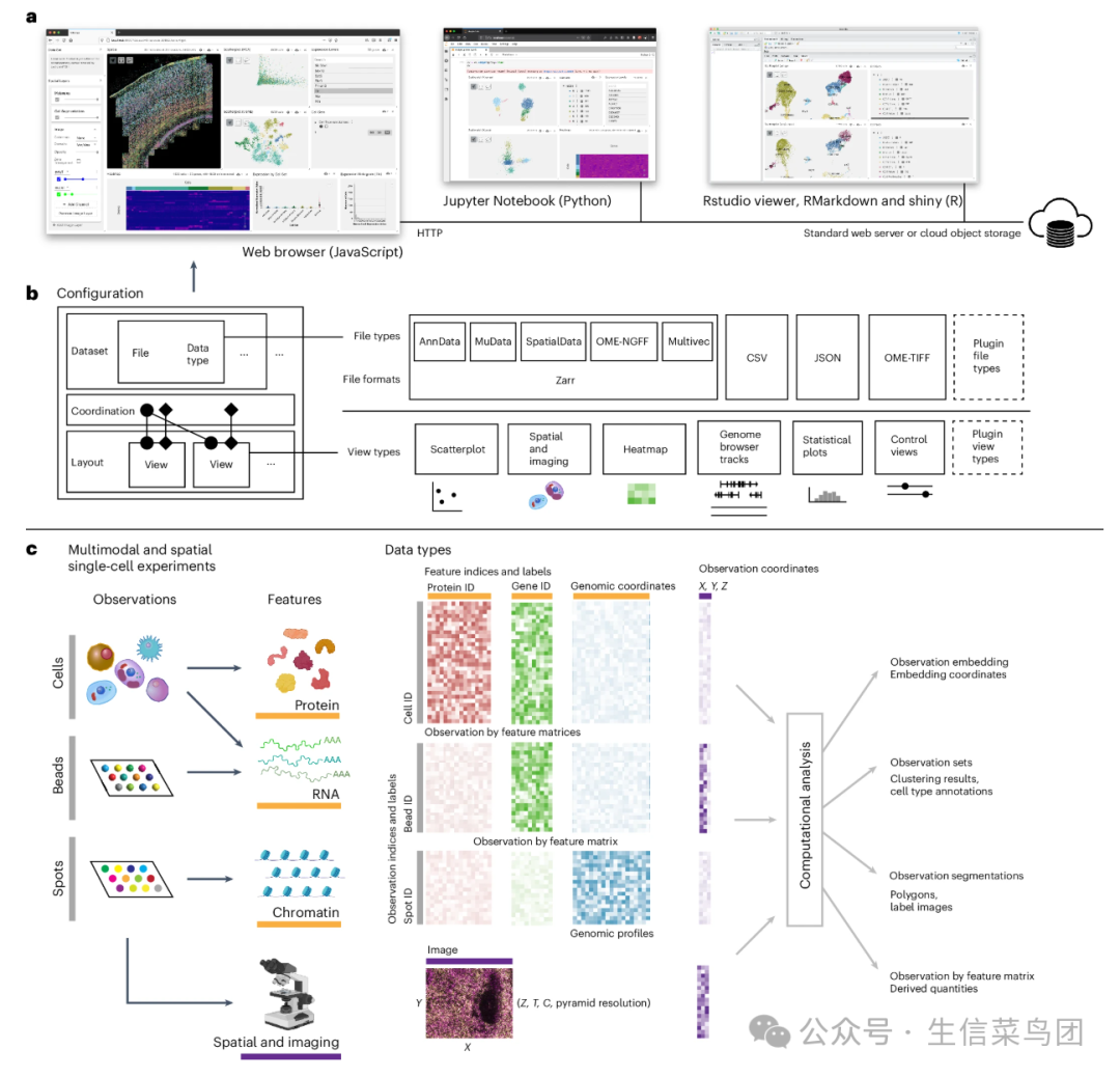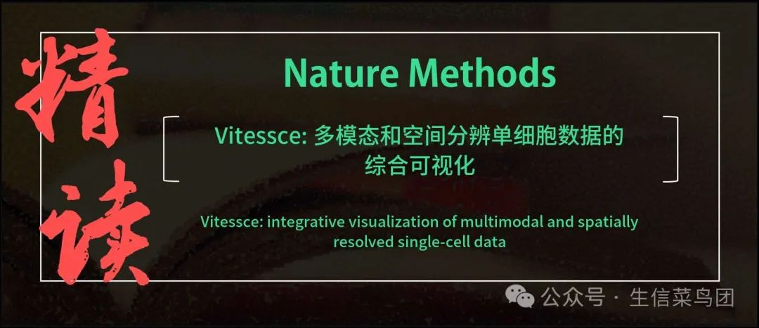 Basic Information 英文标题: Vitessce: integrative visualization of multimodal and spatially resolved single-cell data 中文标题:Vitessce: 多模态和空间分辨单细胞数据的综合可视化 发表日期:27 September 2024 文章类型:Brief Communication 所属期刊:Nature Methods 文章作者:Mark S. Keller | Nils Gehlenborg 文章链接:https://www.nature.com/articles/s41592-024-02436-x Abstract Para_01 多组学技术与单细胞和空间分辨率相结合,使得测量数百万个细胞中的数千种特征成为可能。 然而,同时对高维转录组学、蛋白质组学、基因组映射和成像数据类型进行视觉分析仍然是一项挑战。 在这里,我们描述了Vitessce,一个用于探索多模态和空间分辨单细胞数据的交互式基于网络的可视化框架。 我们展示了在多个协调视图中整合可视化数百万个数据点的能力,包括细胞类型注释、基因表达量、空间分辨转录物和细胞分割。 该开源软件可在http://vitessce.io获取。 Main Para_01 技术手段已经克服了组织和器官在单细胞分辨率下空间定位和多模态测量的挑战,提高了我们区分细胞类型、细胞状态和细胞邻域的能力。 单细胞组学和成像数据的高维度促进了计算模型的发展,这些模型旨在通过分割、聚类成员身份和预测的细胞类型来注释细胞观察。 对整合了基因组学、转录组学和成像模态的多模态和空间分辨的单细胞数据集进行视觉分析可以促进质量控制、结果交流、生物标志物识别以及假设的生成。 Para_02 尽管该领域在实验和计算方面取得了进展,但仍缺乏可扩展的工具来交互式地可视化多模态和空间单细胞数据集。 可视化研究社区已经指出了对异构生物数据集进行视觉分析的工具不足问题,这一问题被称为‘超大规模综合可视组学的挑战’2,3。 目前,多模态单细胞数据集的可视化需要多个不相关的工具,如图像查看器和基因组浏览器,它们支持单一的数据模态。 有助于跨模态发现连接的工具将使多模态实验数据能够充分发挥其潜力,以提高对健康、疾病和调控机制的理解4。 Para_03 最近用于单细胞数据可视化的工具侧重于交互性和可扩展性。 Cellxgene5、Cirrocumulus6 和 Pagoda27 等工具支持使用散点图和热图对包含数百万个细胞和数千个基因的数据集进行交互式探索。 然而,这些工具是为转录组学数据的视觉分析而设计的。 因此,它们缺乏对空间数据类型(如细胞分割)或基因组映射模态(如染色质可及性谱)的支持。 另一方面,TissUUmaps8 和 Napari-SpatialData9 等针对空间数据的工具不支持非空间或基因组映射数据可视化。 迄今为止,单模态数据的重点导致了无法支持跨模态比较和关系以及空间上下文的可视化任务的工具。 Para_04 我们开发了 Vitessce 以克服这些限制,并实现多模态和空间单细胞数据的综合可视化。 Vitessce 是一个可扩展的基于网络的数据可视化框架,支持同时对转录组学、蛋白质组学、基因组图谱和成像数据进行可视化探索(图 1)。 例如,该软件提供了基于 Viv11 和 HiGlass12 工具包的模块,分别用于多尺度多重成像数据和基因组图谱数据的可视化(图 2)。 Vitessce 的一个优势是,它能够在各种情境和计算基础设施中部署空间和单细胞数据的可视化,包括静态网站、Web 应用程序、数据门户、Jupyter Notebook、RStudio 和 R Shiny 应用程序。 Fig. 1: Vitessce can be used in multiple settings and can be configured to visualize raw and derived measurements from multimodal and spatial single-cell experiments.