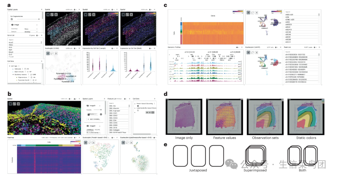 可视化包含多重图像、空间分辨RNA分子和细胞分割的单分子FISH实验。 三维多模态成像质谱(IMS)数据集的体积渲染,旁边附有热图以及基于蛋白质和基于脂质/代谢物的降维散点图的并排展示。 来自10x Genomics Multiome数据集的基因表达和染色质可及性的同时可视化。 Vitessce空间视图中支持的可视化层示意图,即点、斑点、分割和图像。 斑点层和分割层可以根据特征值、集合成员或静态颜色进行着色。 Vitessce支持多个空间分辨率可视化并置和叠加的排列方式。 Chr代表染色体;t-SNE代表t分布随机邻居嵌入;UMAP代表一致流形逼近与投影。 Para_05 来自单细胞RNA测序(scRNA-seq)13和通过转座酶可及染色质测序(scATAC-seq)14的数据,以及多模态和空间技术如转录组和表位测序索引(CITE-seq)15、索引共检测(CODEX)16、Slide-seq17、10x Genomics Visium和Multiome可以使用Vitessce进行可视化。 必须在Vitessce之外或通过插件执行数据(预)处理(例如,降维和细胞分割)18,将可视化与生物信息学算法分离。 Vitessce可以访问存储在静态web服务器和云对象存储中的文件,支持AnnData19,20、MuData21、SpatialData9、逗号分隔值(CSV)、开放式显微镜环境标记图像文件格式(OME-TIFF)22,23和OME-Zarr24,25格式。 Para_06 背景 :