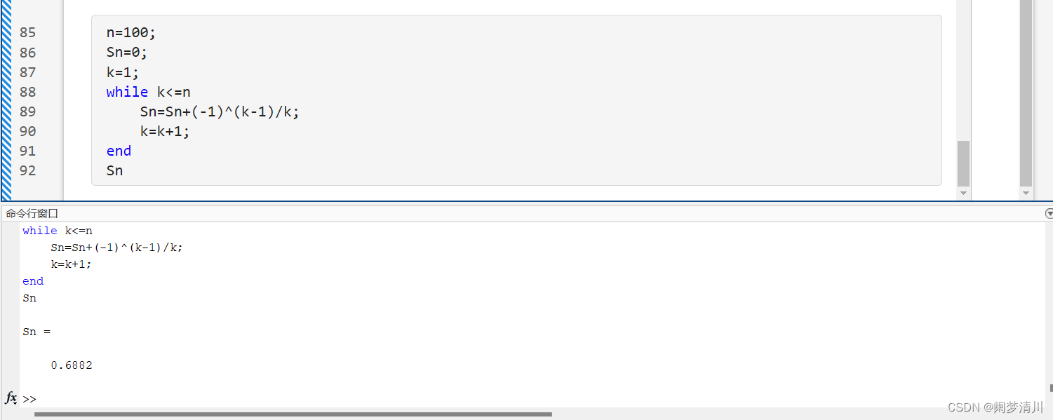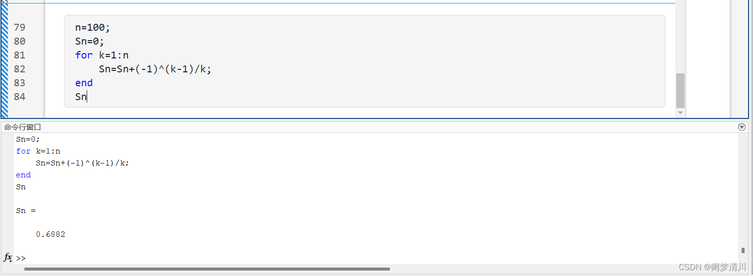 for表示循环的开始,end表示循环的结束,最后把结果Sn显示在命令行窗口上面;