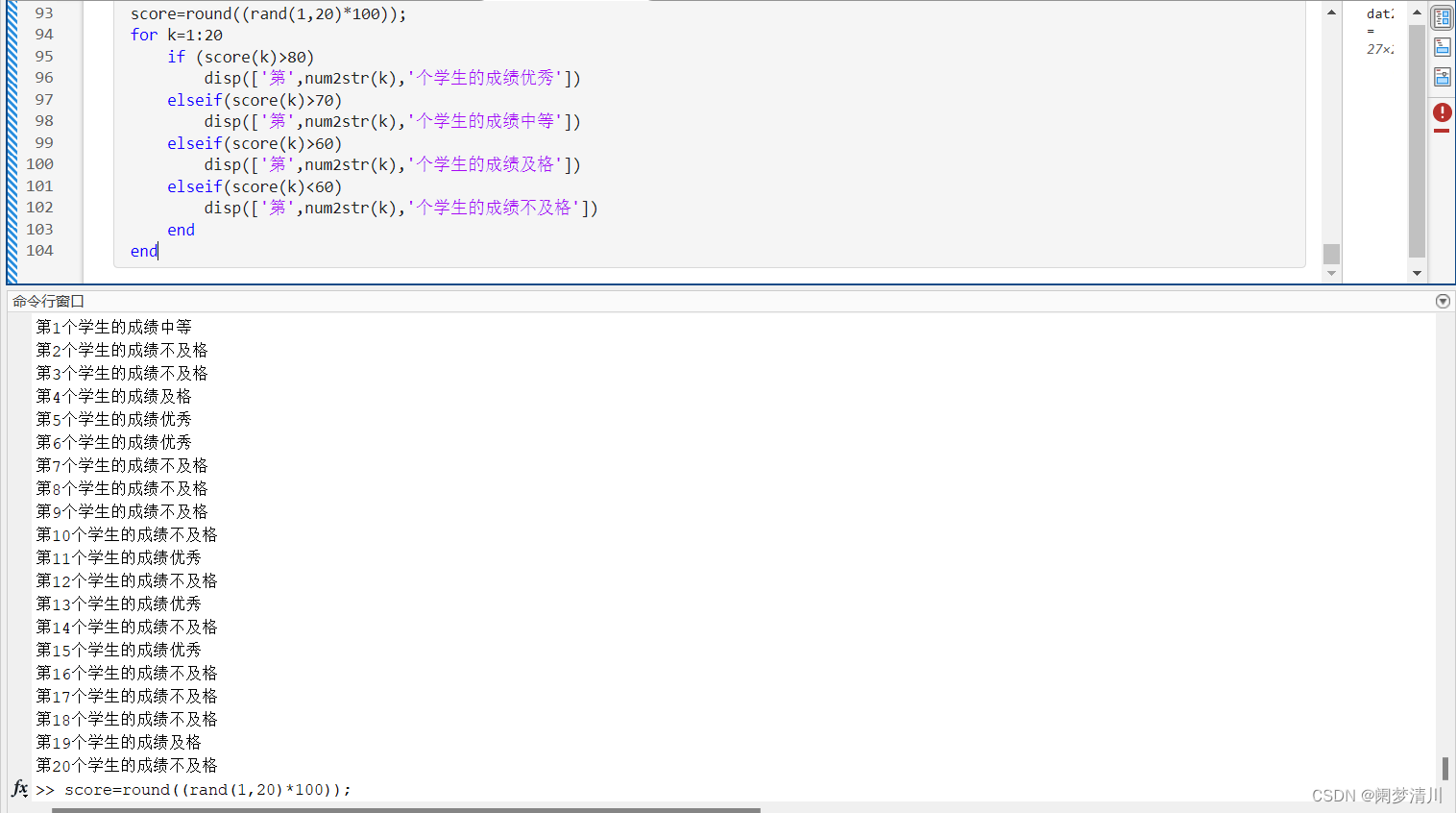 基本逻辑是不变的,while和end是一对的,需要注意的是for循环会自动地进行加上1的操作,但是while不会,因此我们的循环语句里面多加入了一句k=k+1,最后同样是打印结果;