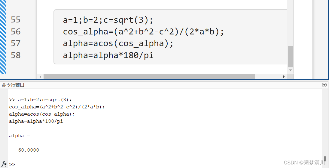 对于一个我们常见的1:根号3:2的直角三角形,我们是这里用MATLAB求一下里面的某个角的大小,代码如下: