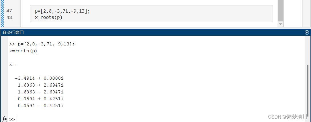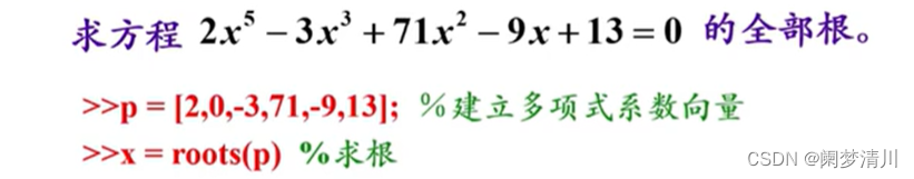 这个方程的解并不在我们的求解范围之内,我们无法使用已学的知识进行求解,这个时候借助MATLAB实现多项式的求解: