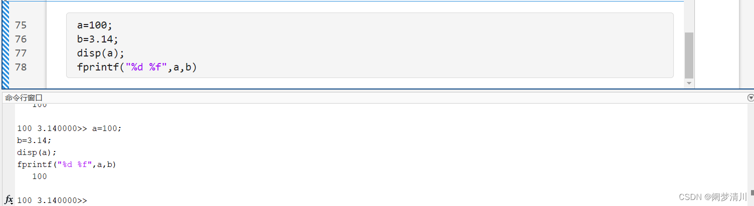fprintf的使用方法类似于C语言里面的printf,都是用来把我们定义的变量的值打印输出,disp的作用就是可以获取我们的变量的值,例如我们写入disp(a),就获取了a的值,屏幕上面就会打印出来100;