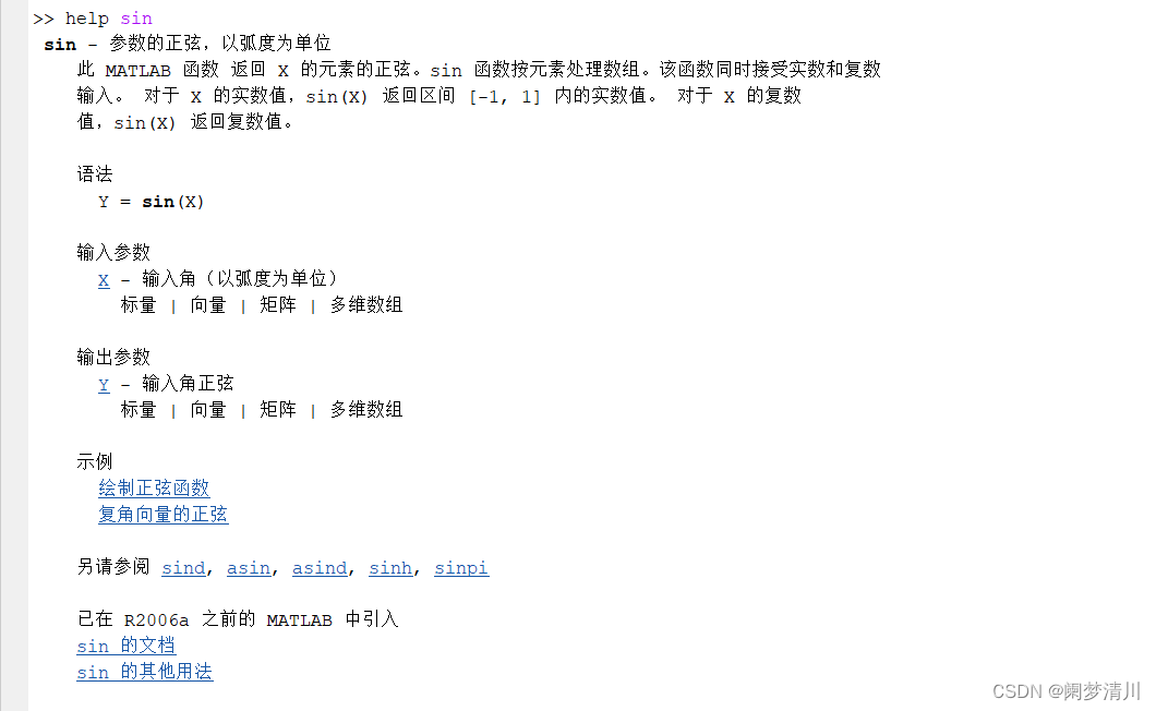 MATLAB函数众多,用法复杂,这个需要我们进行实时查阅,例如我们想查阅MATLAB里面的关于sin三角函数的用法,一种简便的方法就是在命令行窗口里面输入我们的help sin或者doc sin;这两种做法的区别读者可以自行尝试实践以后进行了解,使用help就会把帮助文档显示在我们刚刚输入的命令行窗口,如下图所示: