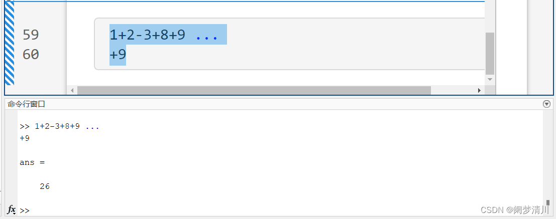 这个符号组要应用于我们的算术表达式很长,我们无法在同一行里面进行正常的显示,这个时候我们就可以使用续行符,这个符号在使用的时候需要在3个省略号的前面加上一个空格,而且下面的一行必须有值,否则就不满足这个符号的使用条件;下面的是一个特别简单的例子: