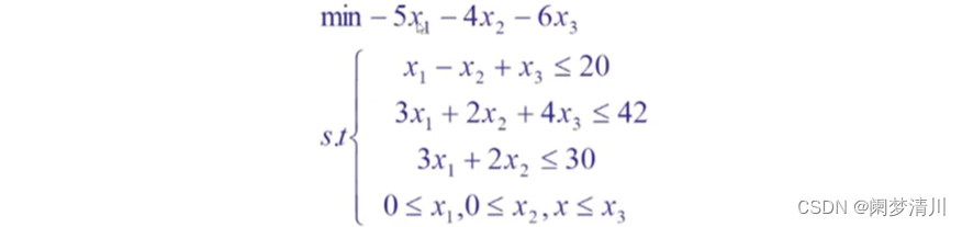 这个题目的意思就是求-5*x1-4*x2-6*x3的最小值(注意,这个里面的x3的范围应该也是大于0的),大括号里面的是一系列的限制条件范围;
