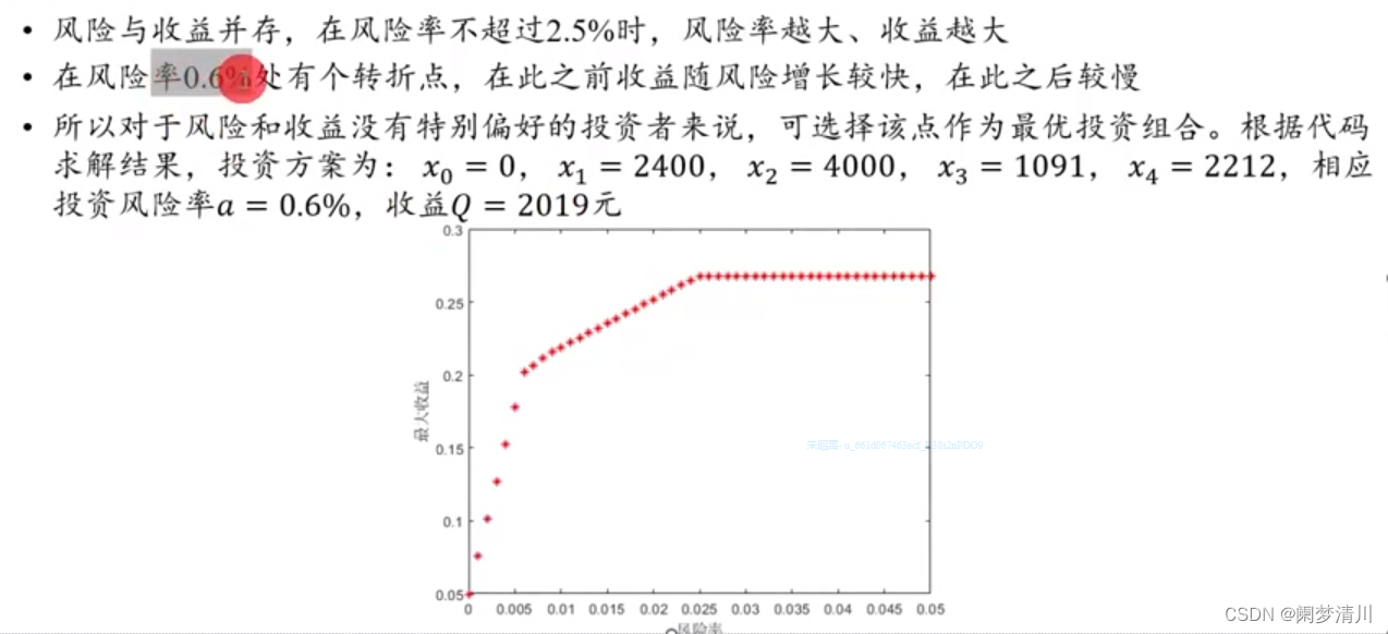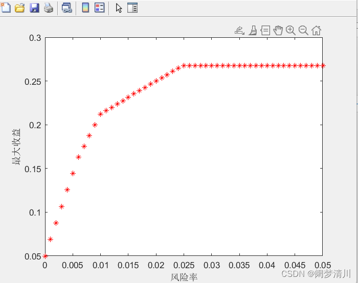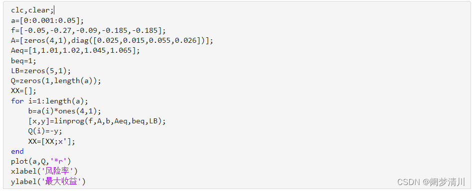 5.循环里面相当于是循环了51次,就是a是以0开始,使用0.001作为步长,以0.5结束,进行求解的,所以是循环了51次,b就是每次循环的时候对应的不同的风险率,4行1列的矩阵;之后调用函数linprog传参求解,MATLAB标准型求的是最小值,我们的循环第四行取相反数得到的是最大值,Q就是最大的投资收益,XX就是对应不同的项目的具体投资金额;