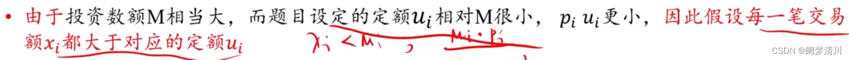 (2)模型假设 模型假设是我们进行建模的时候必须要进行的,我们应该逐步地学习;对于这道题目,我们首先要理清各个变量的意义,以及不同变量之间的各种关系;这个里面的交易费是一个分段函数,我们的投资小于一个指定的数字的时候,需要付对应的交易费,大于这个数字的时候,只需要按照一定的比率进行付交易费即可,这个指定的数据就是ui,我们举一个很简单的例子,我们的投资以100作为分界线,当我们投资20的时候,我们就要付交易费20,但是如果我们投资是2000(任意大于20的数字,就只需要按照一定的比率付交易费,也就是说不同的投资,我们的交易费的计算方法是不一样的;