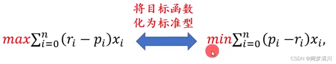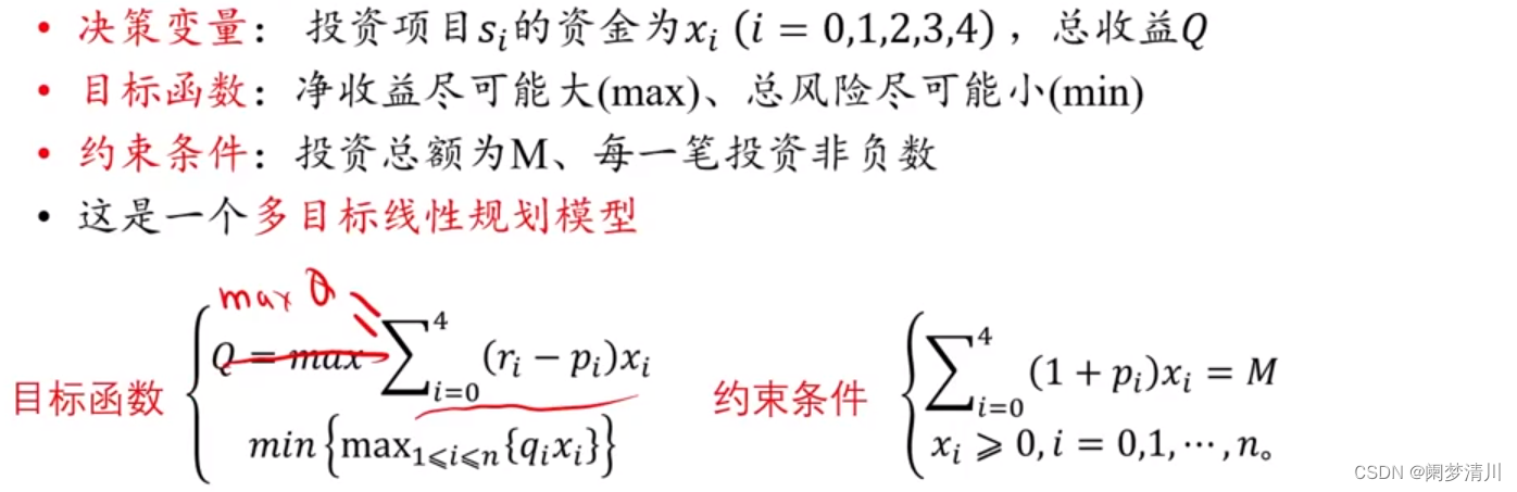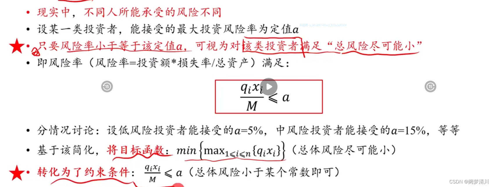 我们的目标函数还要求总体的风险尽可能小,我们也要分别计算单个项目的投资的风险最后相加,那么单个项目的投资的风险如何计算呢?为什么下面的图片里面又是max又是min,我们应该如何进行理解呢?