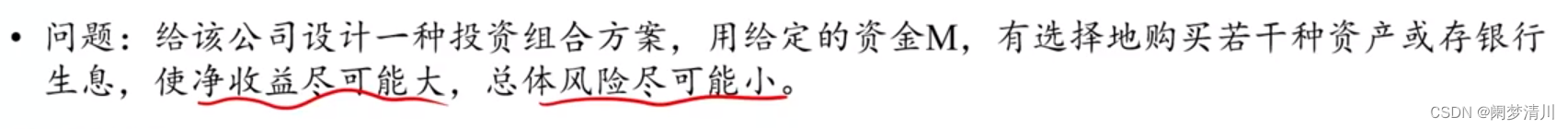我们假设风险率小于某个确定的值,就是为这个总风险最小,这个确定的值就是a,我们表示出风险率使之小于a,这样简化之后,你就会发现,我们的目标函数,从原来的两个到现在的一个,这个投资风险就变成了一个约束条件,只要求表示的投资风险小于我们的a即可;