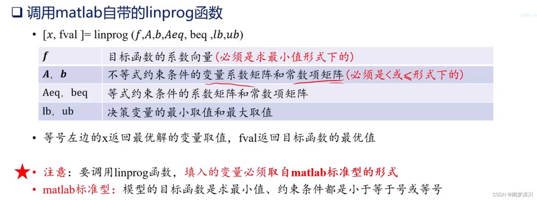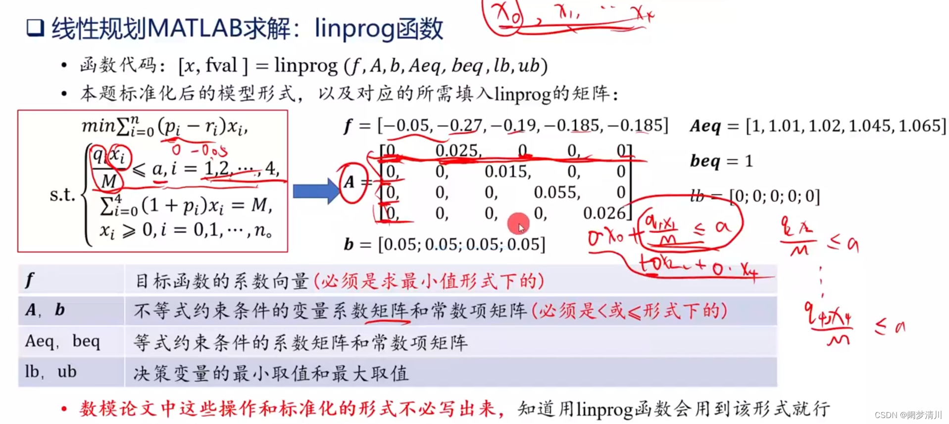 理解标准型,把我们的目标函数化为标准型;MATLAB函数使用的时候,我们输入的变量必须是标准型才可以进行求解,标准形是求最小值,我们想要求解的目标函数是净收益的最大值,我们只需要加负号就可以了,具体的操作如下图所示: