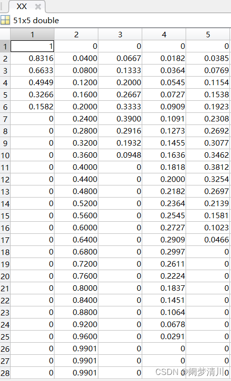 我们通过工作区点击对应的变量就可以查看对应的矩阵,点击xx就可以看到对应每次循环的时候,具体的不同的投资方案;