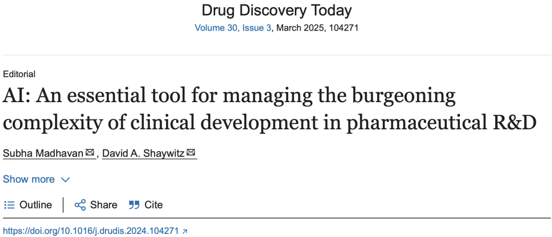 2025年3月,Drug Discovery Today上发表文章AI: An essential tool for managing the burgeoning complexity of clinical development in pharmaceutical R&D,文章探讨了人工智能如何成为管理药物研发中临床开发复杂性增长的关键工具,涵盖从制造、试验设计、数据分析和监管提交等全流程应用,同时强调需解决算法偏见和数据整合等挑战,并指出AI驱动的协作模式将重塑工作方式以加速新疗法开发。