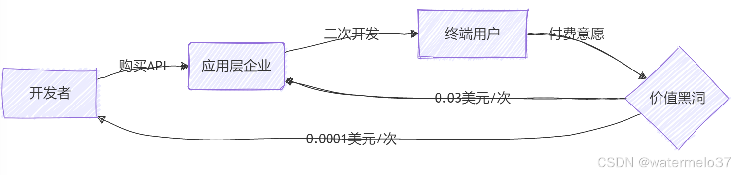 这张价值流动图揭示了致命缺陷:当终端用户每次咨询仅支付0.03美元时,经过应用层企业的抽成,最终流向大模型开发者的收益微乎其微。就像用消防水管接矿泉水,看似水流汹涌实则收获寥寥。但当下又有多少用户愿意给自己的每次提问进行支付呢?