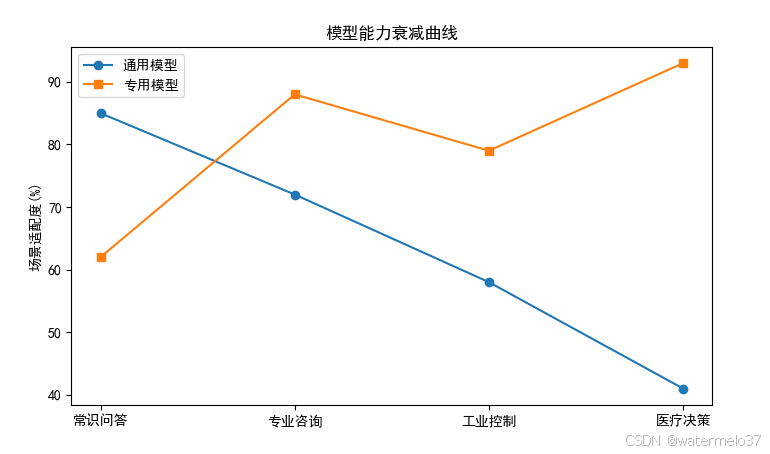 这张模拟曲线图清晰展示了通用模型与专用模型在不同场景的表现差异。当场景专业化程度超过临界点(图中约70%位置),专用模型优势开始凸显。这正是当前AI落地困境的数学表达:没有模型能同时满足"万能"和"专业"的双重需求。