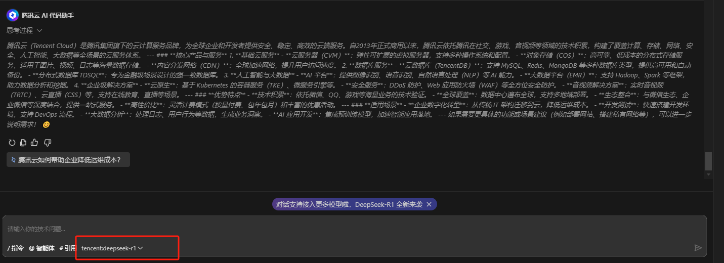 使用腾讯云AI代码助手 将标注地方 改成咱们 的 DeepSeek R1 就可以啦