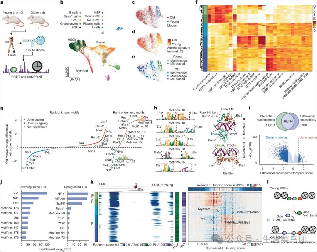 ◉ a, 数据生成和分析的示意图。◉ b, HSC和祖细胞的UMAP图。◉ c, 展示供体小鼠年龄的HSC的UMAP图。◉ d, 展示从参考文献42中获得的老化基因特征活性的UMAP图。◉ e, 展示五个主要HSC亚群的UMAP图。◉ f, 使用基因程序表达来将100个HSC伪批量聚类成五个主要亚群的热图。色标表示每个伪批量的HSC亚群标签,如e所示。◉ g, 已知(左侧,来自cisBP)和新发现(右侧,由seq2PRINT衍生)TF基序按老年与年轻差异染色质变异评分测试t统计量(双尾)排名。显著的cisBP匹配没有的顶级基序被突出显示。◉ h, Ets同/异二聚体的示例复合新基序,还展示了PDB结构的二聚体Runx:Ets(PDB-4L0Z)和Ets:Ets(PDB-2NNY)。溶剂不可及核苷酸碱基被突出显示为紫色,并显示核心Runx和Ets基序。◉ i, 与年龄相关的核小体变化。顶部,展示在老化过程中具有差异核小体和差异可及性的cCRE重叠的维恩图。底部,老化过程中差异核小体变化的火山图,用密度伪彩色。◉ j, 在老化过程中丢失的核小体足迹处的TF基序富集(足迹得分的绝对差异大于1且错误发现率(FDR)小于0.01)。上调节(右侧)或下调节(左侧)的前十个富集基序。◉ k, 在老年和年轻HSC中chr. 6:24664695–24665494位置Wasl启动子的组织。左侧,核小体足迹(100 bp比例尺);行代表单个HSC伪批量,列代表单个bp位置。左侧色标表示HSC亚群,如e,f所示;中间色条表示伪批量中的染色质可及性和Wasl RNA水平;右侧,顶部色条表示跨伪批量的平均seq2PRINT预测的TF结合评分。热图显示每个伪批量中的TF结合评分,在通过减去列均值进行居中后。◉ l, 与年龄相关的cCRE重组的示意图。◉ a中的插图使用BioRender创建(https://biorender.com)。