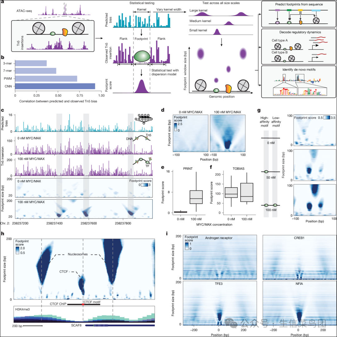 ◉ a, 多尺度足迹工作流程概述。◉ b, 比较不同Tn5偏差校正模型性能的条形图。◉ c, 在包含0 nM(顶部)或100 nM(底部)MYC/MAX的BAC DNA上,在示例区域chr. 2:238237173–238237972处预测的Tn5偏差、观察到的Tn5插入和多尺度足迹。◉ d, 在包含0 nM或100 nM MYC/MAX的BAC DNA上,在MYC/MAX基序位点上的聚合多尺度足迹。◉ e, f, 在包含0 nM或100 nM MYC/MAX的MYC/MAX基序位点上的足迹评分箱线图,显示PRINT(e,位置数= 275)和TOBIAS18(f,位置数= 158)的结果。◉ 盒子显示第一、第二和第三四分位数,须显示最远点落在第一四分位数减去1.5倍四分位距(IQR)或第三四分位数加上1.5倍IQR范围内。◉ g, 在包含0 nM(顶部),50 nM(中间)和100 nM(底部)MYC/MAX的两个相邻MYC/MAX基序位点上的多尺度足迹。◉ h, 在HepG2细胞中的cCRE区域chr. 6:154732971–154733770内的多尺度足迹。下层轨道是叠加的ENCODE组蛋白ChIP信号。◉ i, 包括AR、CREB1、TFE3和NFIA在内的示例转录因子的聚合多尺度足迹。CNN,卷积神经网络。