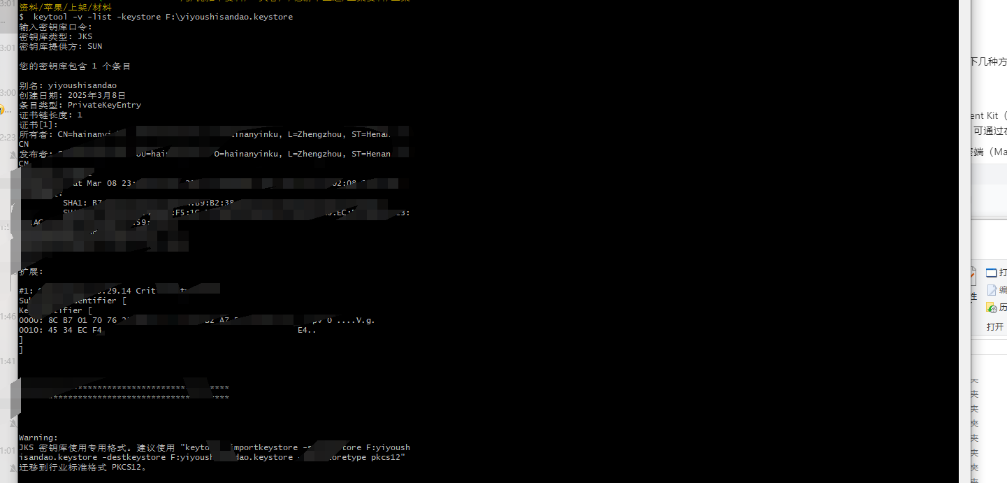keytool -v -list -keystore C:\Users\Admin\mykeystore.keystore执行命令后,系统会提示输入 keystore 的密码。输入正确密码后,命令行将输出该 keystore 文件的详细信息,包括证书指纹(如 MD5、SHA1、SHA256 等)、证书有效期、所有者信息等,其中证书指纹部分就是应用签名的关键信息 。