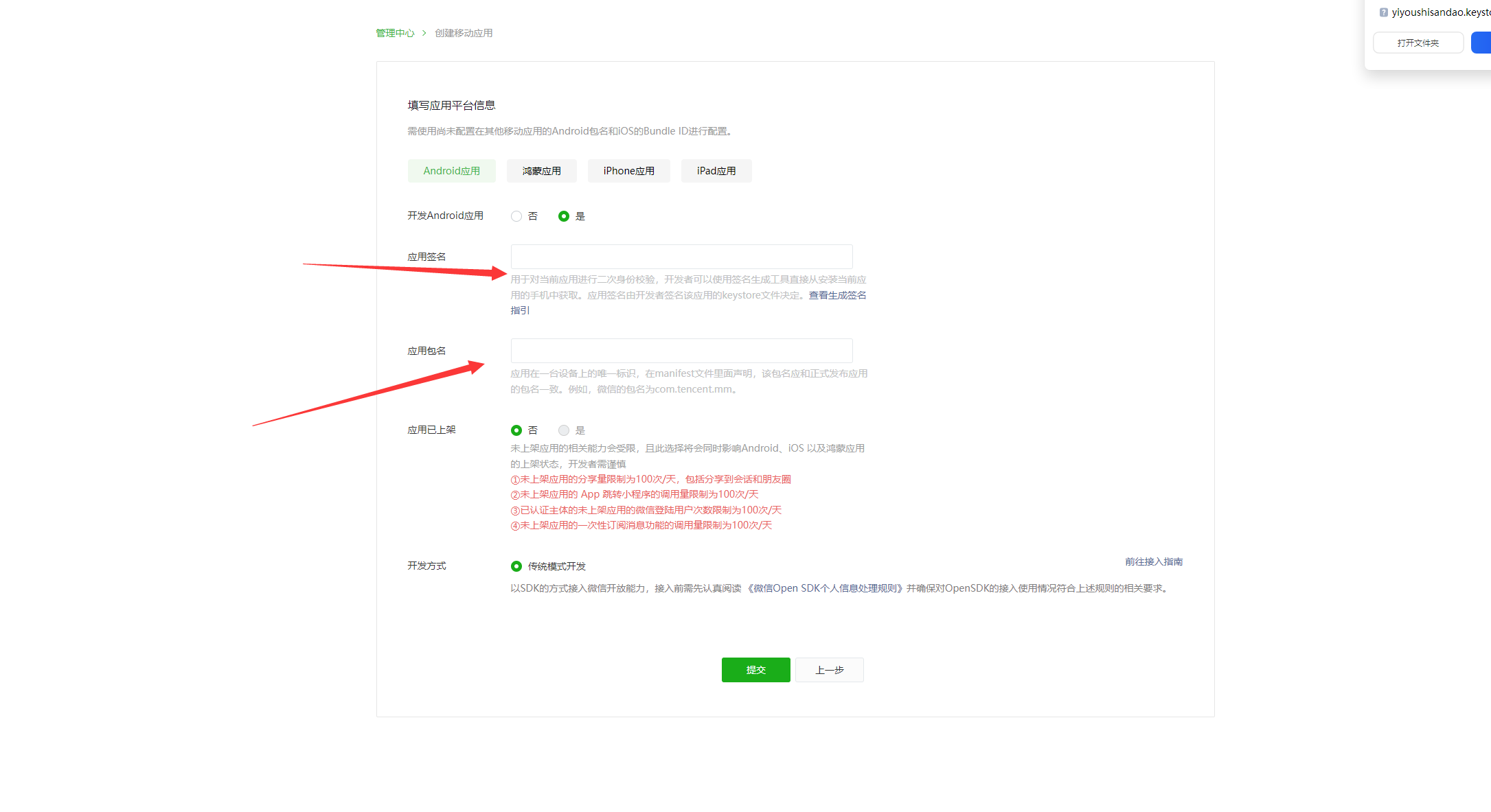 一般到此处,app需要提交签名信息和包名信息,目前我们这里只先管安卓,那么
