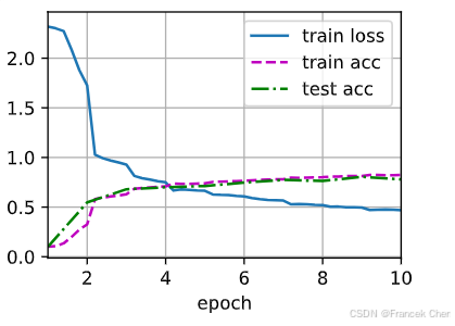 如下所示,训练函数train_ch6也类似于softmax回归的从零开始实现中定义的train_ch3。由于我们将实现多层神经网络,因此我们将主要使用高级API。以下训练函数假定从高级API创建的模型作为输入,并进行相应的优化。我们使用在参数管理中介绍的Xavier随机初始化模型参数。与全连接层一样,我们使用交叉熵损失函数和小批量随机梯度下降。